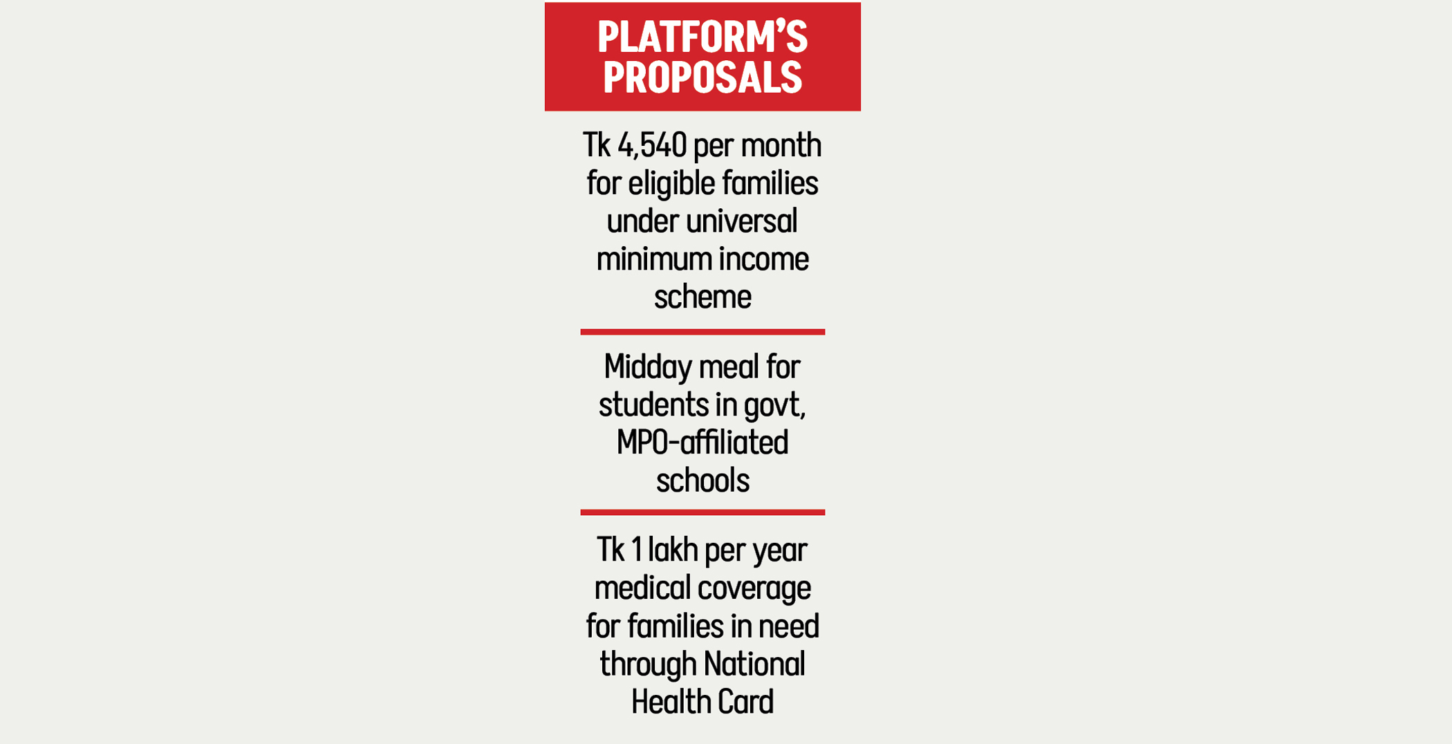Universal minimum income, school meals, youth loans and a national health card headlined in the package.