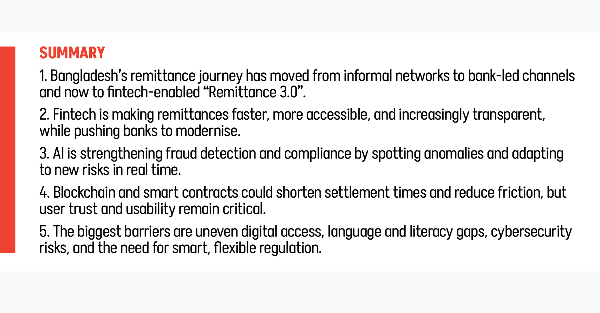The future of remittances in Bangladesh depends on how well technology, policy and people are aligned. Remittance 3.0 offers a chance to formalise flows, deepen trust and unlock productive use of diaspora capital. If guided by smart regulation and user-first design, fintech can transform remittances into a strategic tool for sustainable growth.