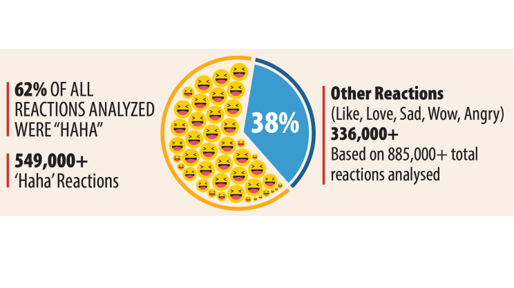 Together, these posts drew 8,85,811 reactions. Of them, 5,49,129 (62%) were “hahas,” with at least 19,708 coming from profiles that bear all the hallmarks of bot accounts.