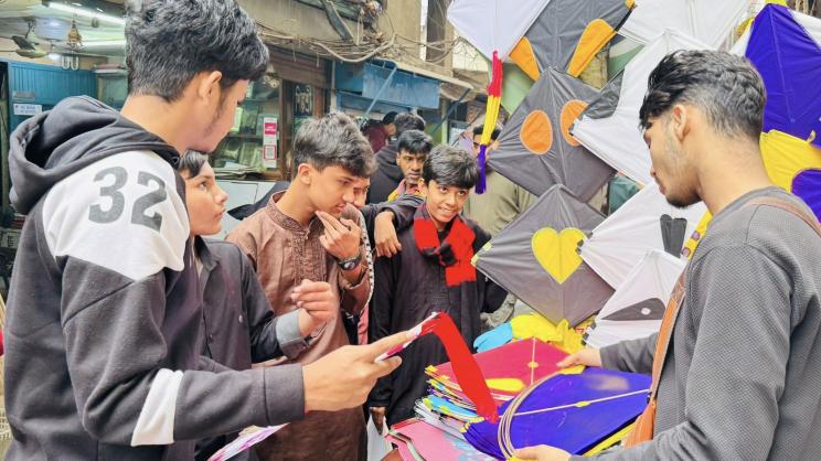 Kite trading is brisk, alongside preparations to decorate rooftops with bamboo frames, boxes and temporary canopies.
