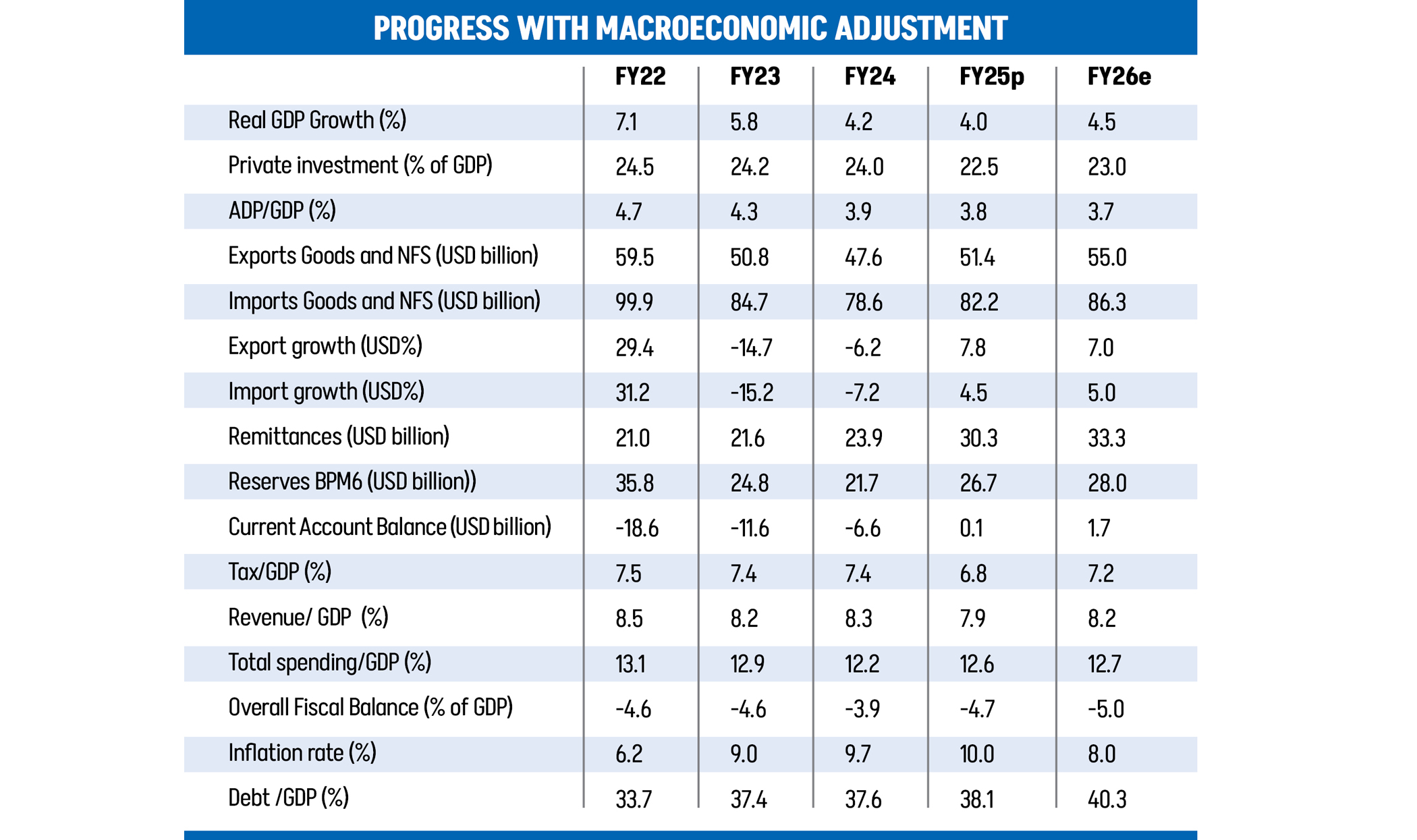 Significant progress has been made in stabilising the macroeconomy (Table 1). The current account of the balance of payments has turned around from a large negative number to positive, reserve run down has been arrested and a modest recovery of reserves is now underway. The upward trend in inflation has been contained with a modest slowdown in inflation. On the other side, the quality of the macroeconomic adjustment has been weak. Private investment rate has fallen significantly. Public ADP spending has been cut sharply. GDP growth has continued to slide, falling to a low of 4 per cent in FY2025.