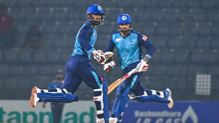 In a rare sight in cricket, Afghan all-rounder Mohammad Nabi and his son, Hassan Eisakhil, featured for the same team in a Bangladesh Premier League (BPL) match in Sylhet on Sunday. In a touching moment, Eisakhil was handed his cap before the game as he made his BPL debut. Playing for Noakhali Express against Dhaka Capitals, he immediately stamped his authority with a 60-ball 92 while sharing a 53-run fourth-wicket stand with his father, who made 17 off 13 deliveries. The 41-year-old Nabi and his 19-year-old son, however, had played against each other in competitive cricket in July last year during the Shpageeza Cricket League (SCL), Afghanistan’s premier T20 tournament. Photos: Noakhali Express/STAR