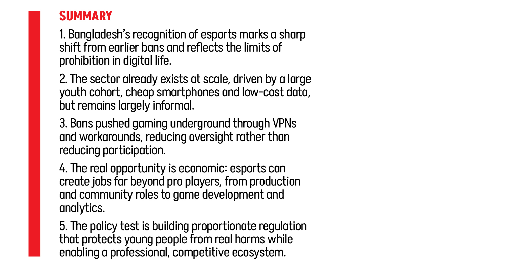 The question now is not whether Bangladesh will have an esports sector. It already does. Rather, it is whether policymakers can construct a regulatory architecture that allows the industry to flourish while mitigating its genuine risks, an approach several south-east Asian neighbours have been refining for years.