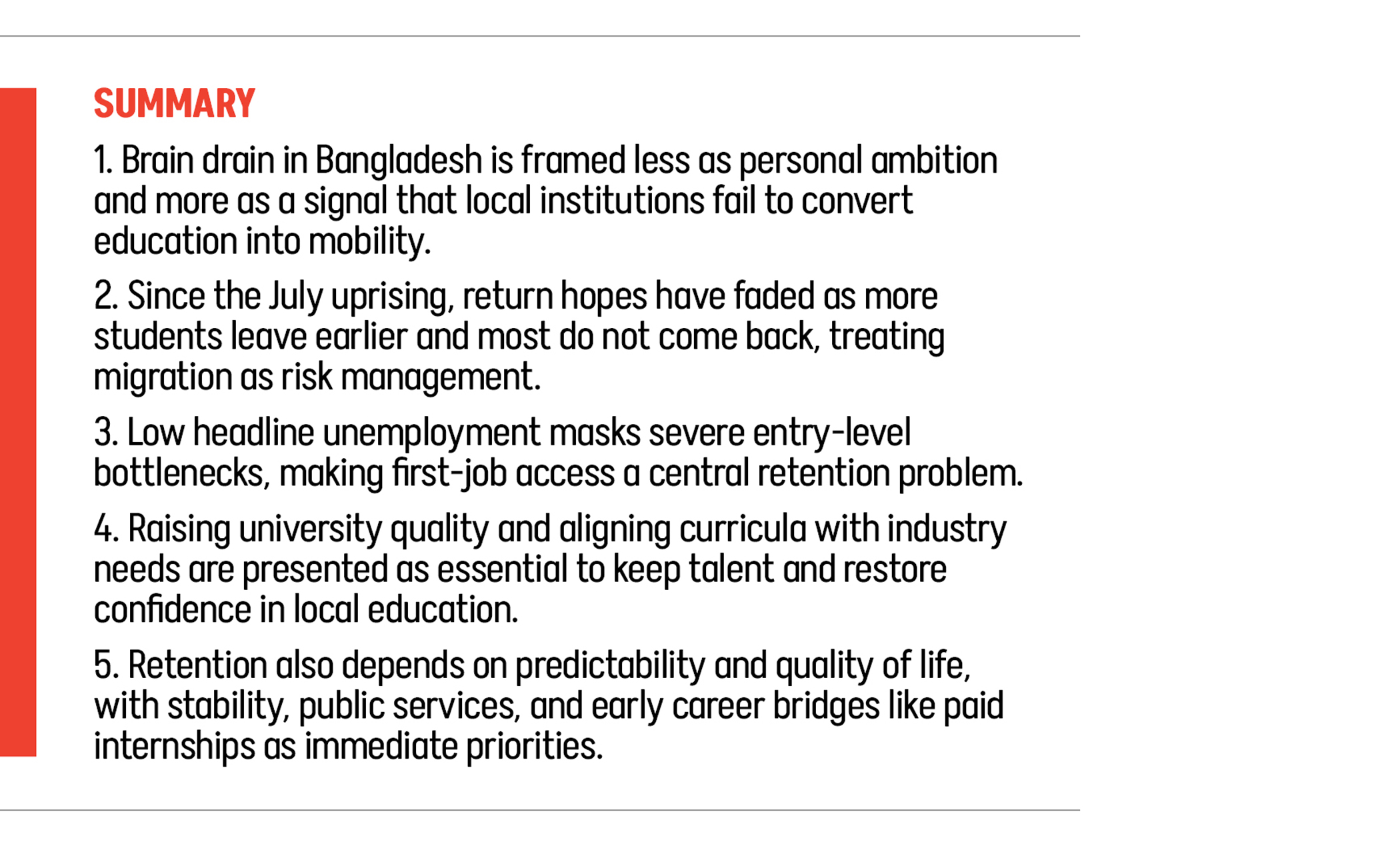 Although often said in jest, the phrase “the great Bangladeshi dream is to leave Bangladesh” is becoming a reality. Here, brain drain is less a story of lack of interest and more a structural signal that our institutions do not reliably convert education into mobility at home.