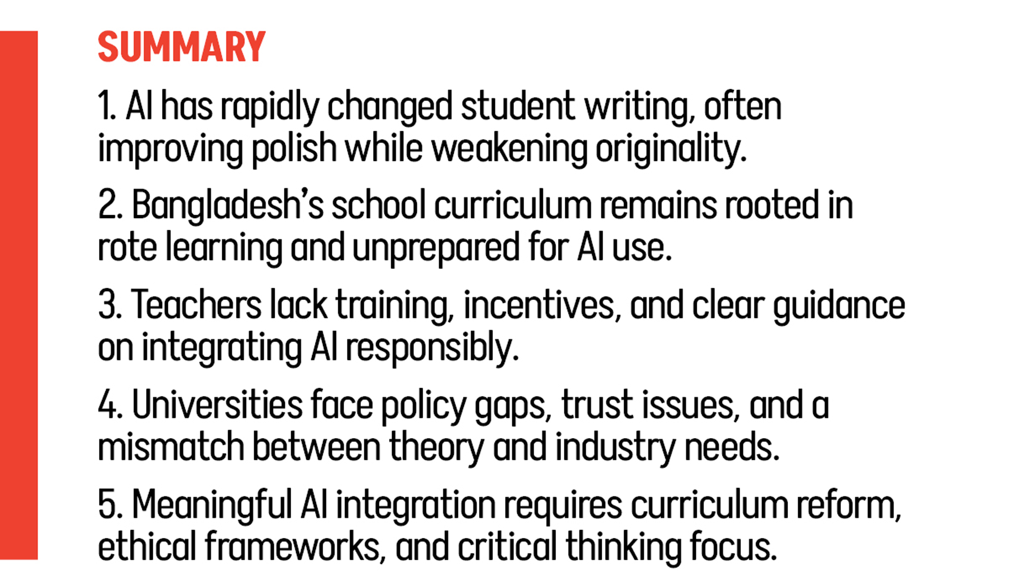 Reflecting on the national school curriculum of the country, Mahfuzul Haque Sadim Chowdhury, an assistant teacher at Milestone School and College, opines that the curriculum is barely prepared to deal with the rapid growth of AI. He says, “School students are stuck at rote learning, and that makes them more vulnerable to misuse of AI, as they are habituated to treating writing tasks as a product instead of a process that needs to be developed through the conjunction of reflection and critical thinking. On top of that, teachers are not trained to incorporate AI in the learning process, and often their abysmal salary structure does not even incentivise learning and receiving training, as they are more prone to offering private tuition. After all, teachers have to sustain their basic necessities.”