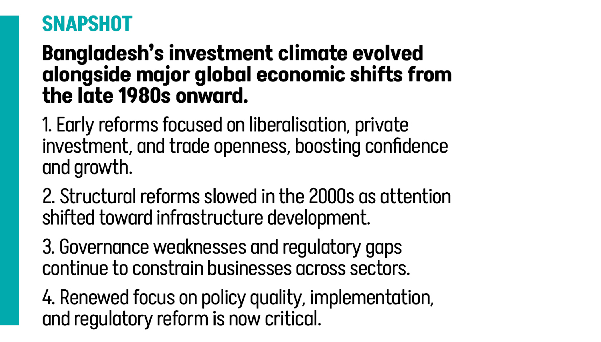 Regulations exist to set clear rules for businesses, making sure profit-making doesn’t come at the cost of public interests—whether it’s environmental protection, product quality, worker safety, or fair wages. Good regulations give businesses clarity, support innovation, and help the economy grow. But for regulations to work well, they must be relevant, easy to understand, and properly enforced. In Bangladesh, many rules are outdated, overlapping, or badly administered. This makes compliance costly and opens doors for harassment—problems that hold businesses back.