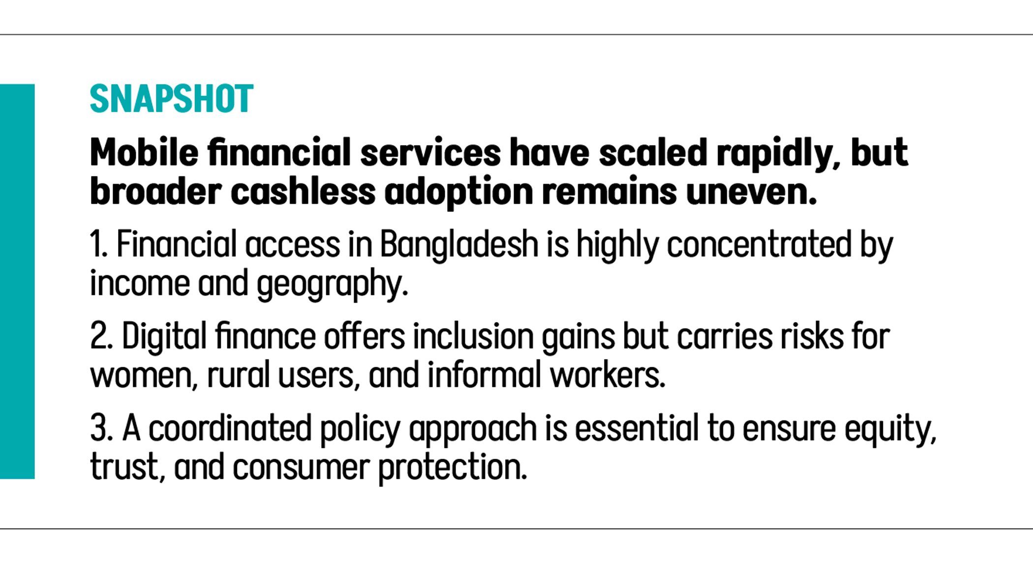 On the whole, Bangladesh is at a pivotal moment in its financial evolution. While the infrastructure for digital finance is rapidly maturing, the trajectory of its cashless transition remains uncertain. A deliberate, inclusion-oriented approach is essential to ensure that digitalisation does not entrench existing inequalities. A cashless economy is not merely the digitisation of transactions: it is a reconfiguration of economic participation. If designed with equity at its core, it can democratize access to finance and enable shared prosperity. Without such intent, however, the shift risks becoming another uneven transformation that benefits the connected few and intensifying financial exclusion.