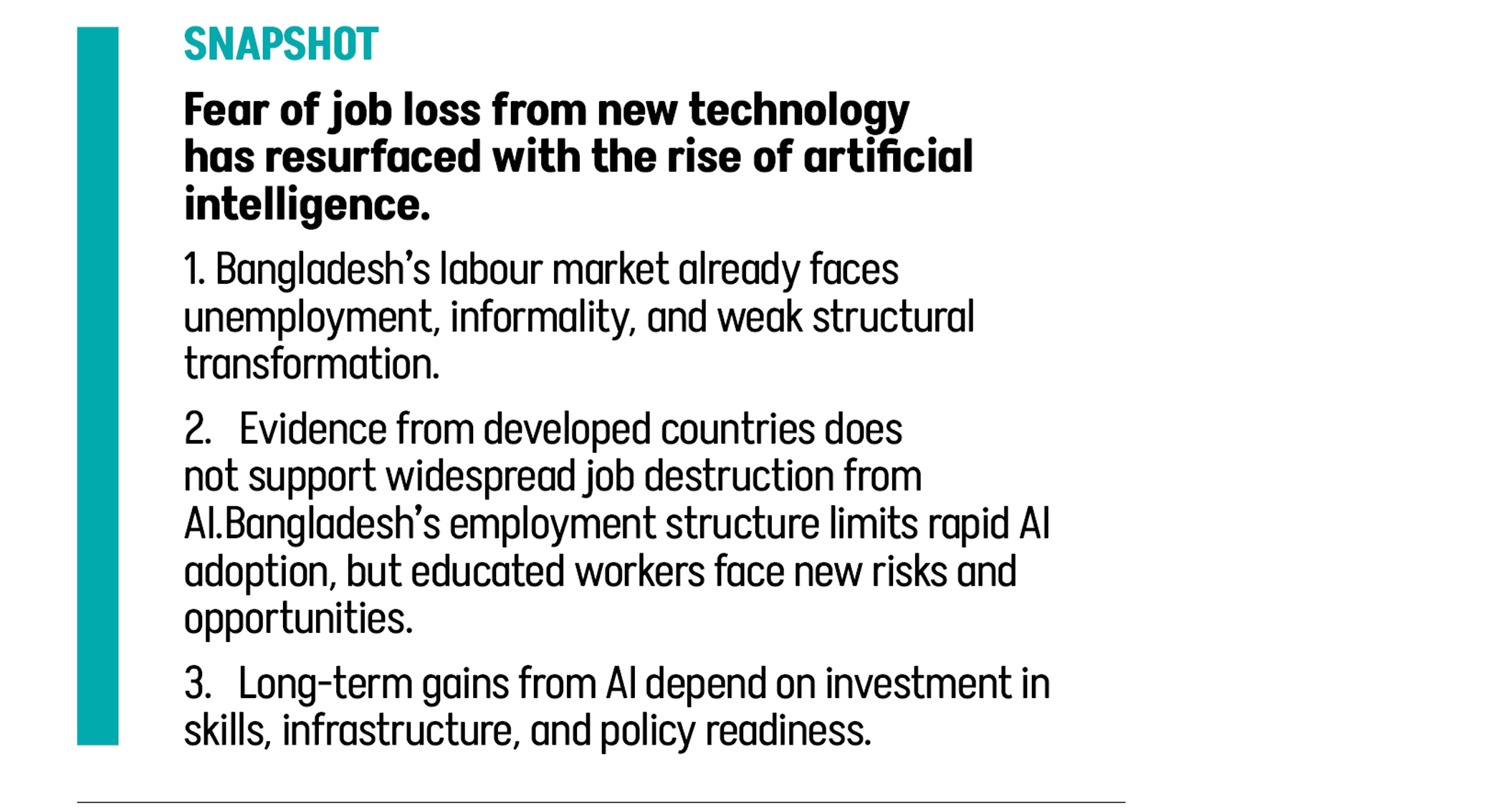 Bangladesh’s labour market already faces unemployment, informality, and weak structural transformation. Evidence from developed countries does not support widespread job destruction from AI. Bangladesh’s employment structure limits rapid AI adoption, but educated workers face new risks and opportunities. Long-term gains from AI depend on investment in skills, infrastructure, and policy readiness.