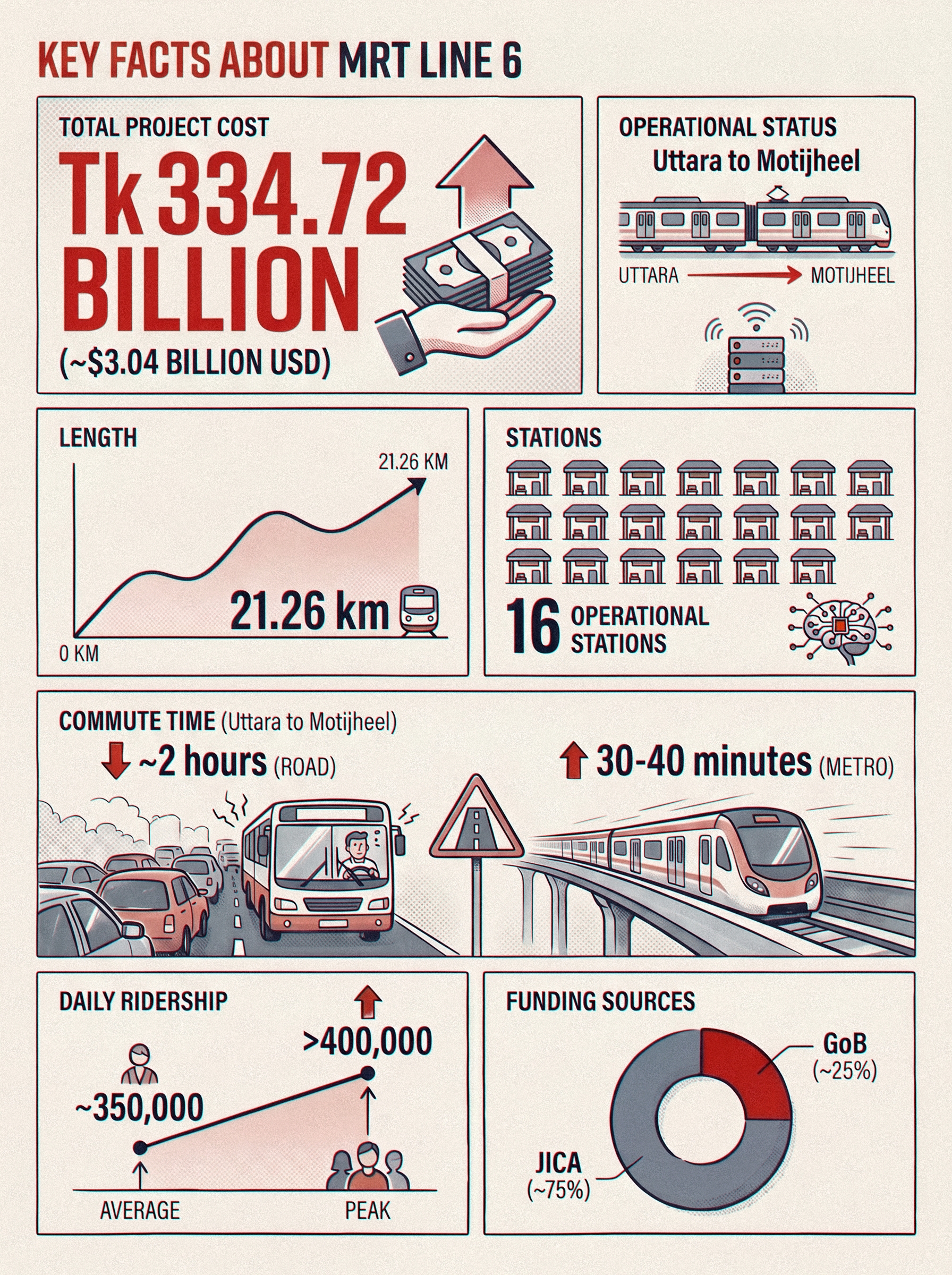 Despite the huge cost, MRT Line 6 has made a real difference for some Dhaka residents. It's popular, with about 350,000 to 400,000 riders daily. This popularity stems from how much it reduces commute times on that really busy Uttara-Motijheel route. Travel time has dropped from about two hours by road to just 30-40 minutes on the metro, saving commuters a lot of time and making their journeys more reliable. Once all stations are open, including the extension to Kamalapur, along with an increase in the number of coaches and a reduced headway, daily ridership for Line 6 is expected to reach around 500,000, with long-term capacity of up to 60,000 passengers per hour in each direction.