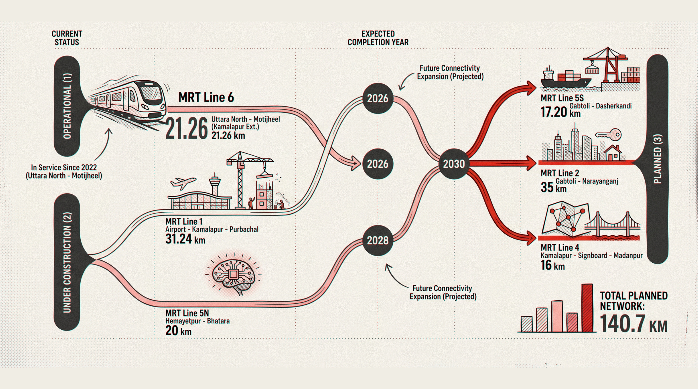 Dhaka's metro network is planned for aggressive expansion. Works are already underway to extend Line 6 further south to Kamalapur Railway Station, a major transport hub. Plans are in motion to extend the network northward towards Tongi and westward towards Savar. Work is ongoing for MRT Line 1 (airport to Kamalapur and Purbachal) and MRT Line 5 (Hemayetpur to Bhatara).