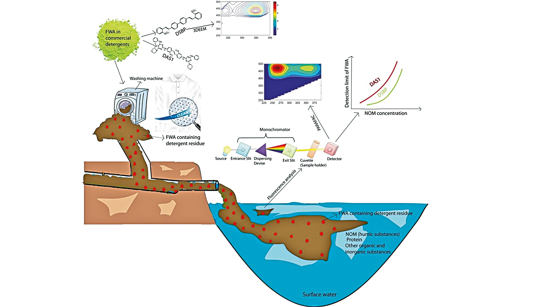 Mixing of fluorescent whitening agents from detergents into freshwater.