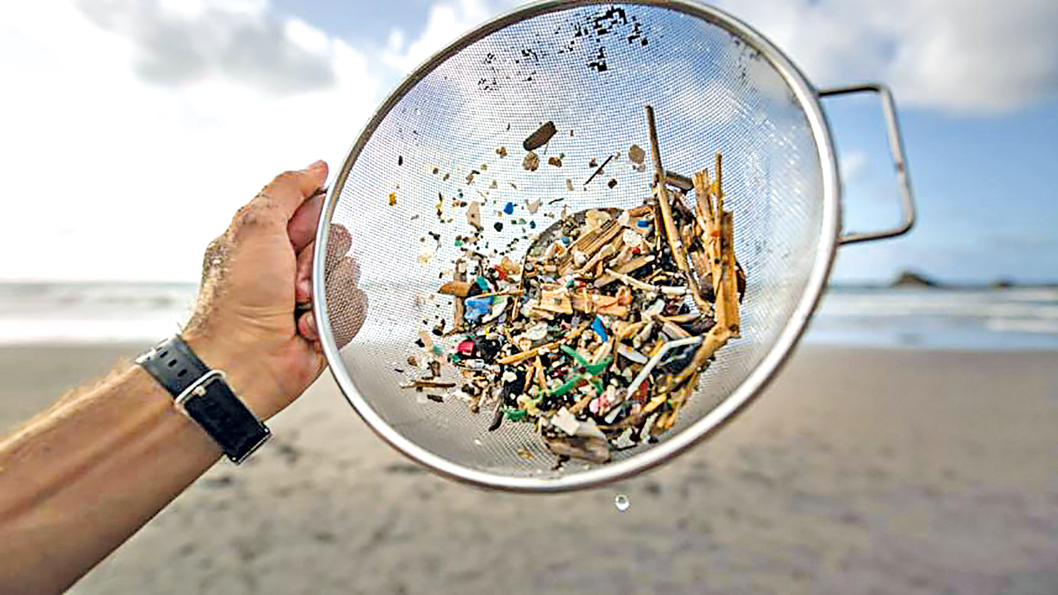 Microplastics and other debris collected from a beach through sieving, revealing the scale of plastic pollution that often remains invisible in coastal and marine environments.