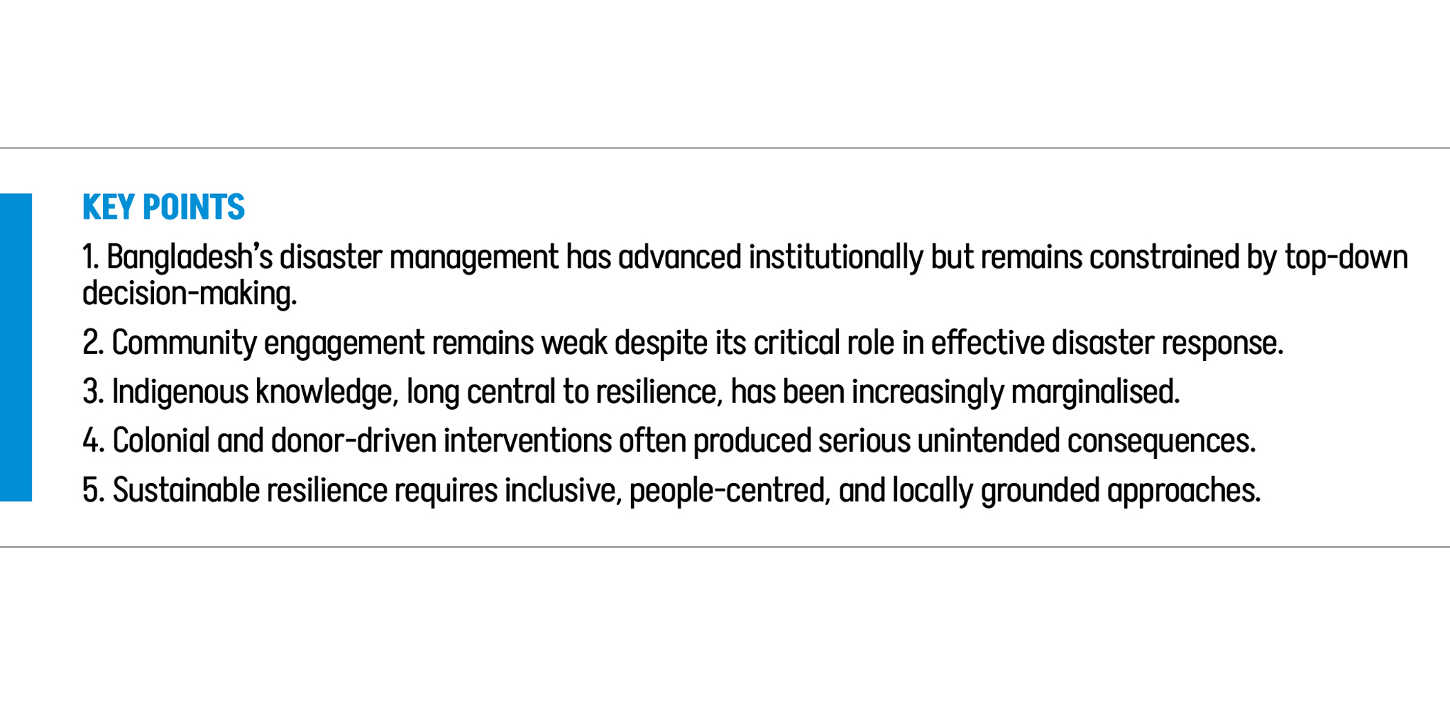 To make disaster management in Bangladesh more people-sensitive and responsive, greater emphasis is needed on community-centred and inclusive approaches rather than a predominantly top-down system. Local people—especially women, persons with disabilities, the elderly, ethnic minorities, and the urban poor—should be meaningfully involved in risk assessment, planning, and decision-making so that warnings, shelters, and relief reflect real needs and social realities. Early warning messages must be simplified, localised, and delivered through trusted channels and local languages to ensure last-mile reach. Strengthening local government institutions with adequate resources, trained manpower, and decision-making authority can significantly improve rapid response and accountability. Disaster shelters and recovery programmes should prioritise dignity, privacy, livelihoods, and long-term resilience rather than only emergency survival. Finally, transparent data sharing, feedback mechanisms from affected communities, and stronger coordination between government, NGOs, and community groups can help ensure that disaster management systems respond quickly, fairly, and with empathy to the people they are meant to serve.