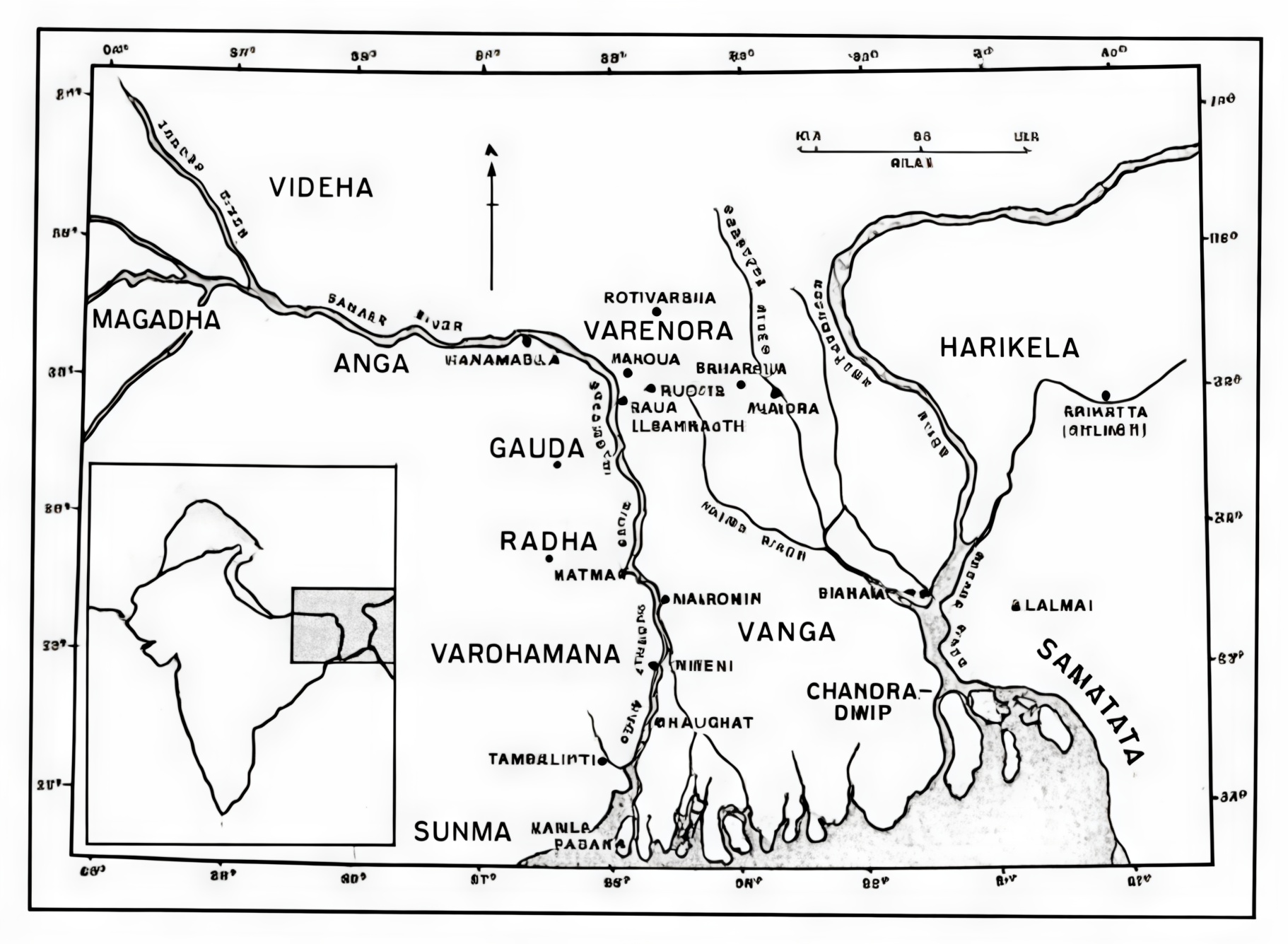 The Bengal delta, a flat, low-lying floodplain shaped by the Ganges, Brahmaputra, and Meghna rivers, has been built up over millennia. Rivers served as transport routes and defined cultural subregions: Varendra, Bhagirathi–Hooghly, Vanga, Samatata, and Harikela. Human settlement dates back to the second millennium B.C., with tribes such as the Pundra, Raḍha, Suhma, and Vanga lending their names to regions. Archaeological evidence shows rice cultivation, systematic housing, cemeteries, and copper ornaments. Early agriculture involved shifting cultivation, using stone tools for rice and millet farming. Proto-Munda speakers may have pioneered these systems around 1500 B.C. By the sixth–fifth centuries B.C., the middle Gangetic Plain had shifted to permanent wet-rice farming, requiring communal labour, irrigation, and improved tools such as iron axes and ploughshares, marking the transition to advanced rice agriculture and laying the foundation for Bengal’s agrarian society.