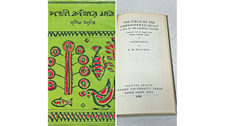 In 1964, Tofail Ahmed, a collector of folk art, lamented that the kantha was “a lost art.” He noted that Jasim Uddin’s poem had become better known than the article itself and that, when the average Bengali spoke of the nakshi kantha or heard the term, it was the poem that was referred to or understood. With changing tastes and lifestyles, the popular craft of kantha was becoming a lost art. He believed that it would be in Jasim Uddin’s poem alone that the kantha would be preserved. “Drishtibhangi o paribartaner sange purba Pakistaner e gana shilpa lupta hoye jacche. Pallikabi Jasimuddiner ‘Naskshi Kanthar Maather’ bhitar diye amar thakbe e lupta shilper smriti.”