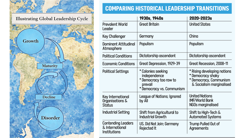 Britain’s leadership began after corn tariffs were lowered in 1846 to promote economic growth, while the US’ leadership began in 1934 to escape economic depression. In its growth phase, Britain launched the first and second industrial revolutions on RMGs and steel, respectively, replacing the East India Company to govern the colony of the British Empire. Correspondingly, the United States signed the Atlantic Charter in 1941 to replace the League of Nations with the United Nations, then constructed the IMF and World Bank in 1944. When World War II ended, the Marshall Plan revived developed countries from 1947 and NATO protected them from 1949. Economic competition was fundamental for Britain, but military strength was the ace card. Britain won the first and second world wars only because of US military intervention. US leadership salvaged Europe from the Soviet Union’s peril. Today Trump distances Europe, but previous US leadership needed it. They were the top free-riders of US economic and military resources, which Trump does not want.
