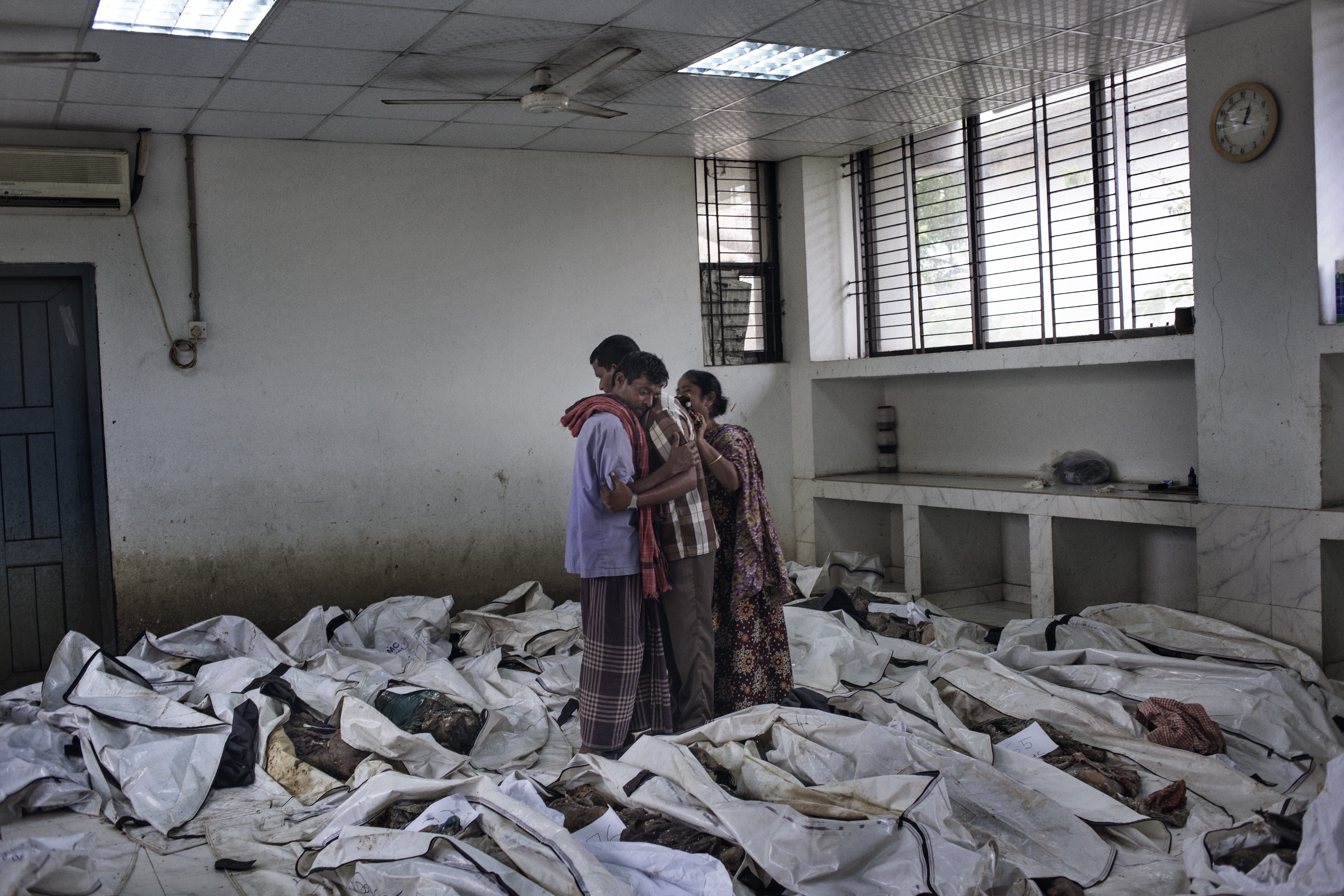 Grieving relatives comfort one another at a morgue in Dhaka as they attempt to identify loved ones among the victims of the Rana Plaza collapse, twelve days after the disaster. Photo: Author