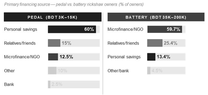 Borrowing is therefore not incidental to the battery rickshaw economy. It is built into it. In the Innovision survey, 59.7 per cent of battery rickshaw owners said they had financed their vehicles through NGO or microfinance loans. The mean loan value was approximately Tk 80,000, and interest rates ranged between 20–38 per cent. Rustam himself took a Tk 65,000 loan for his vehicle.