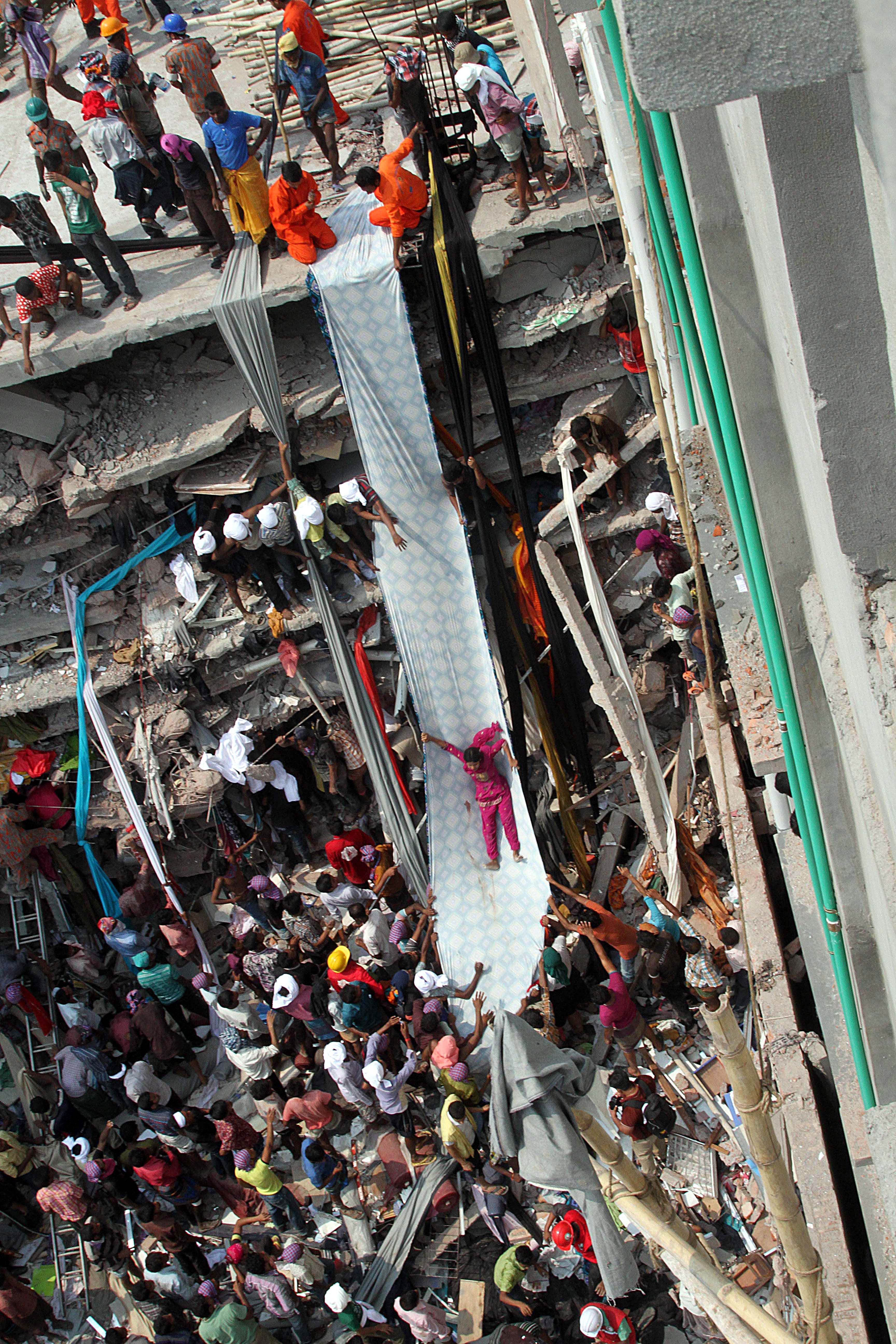 A survivor is carefully lowered to safety using makeshift fabric slides during the harrowing rescue operations at the garment factory site. File Photo: Star