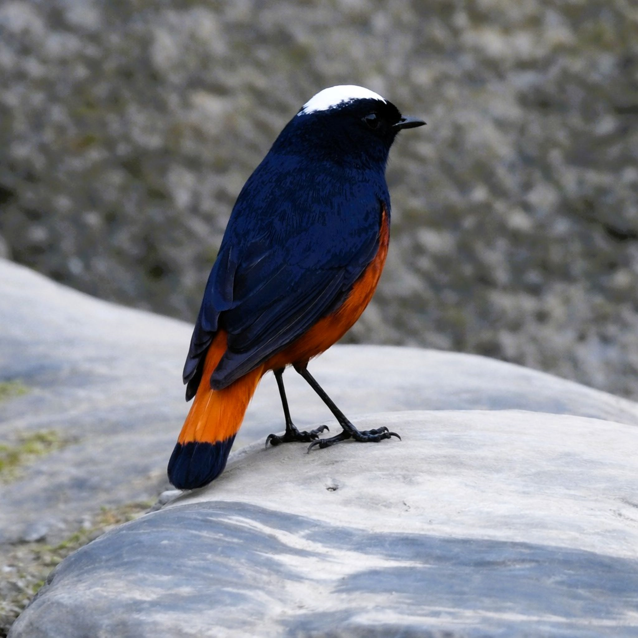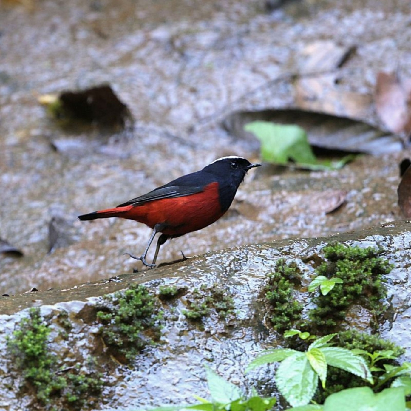 A white-capped, reddish-black fellow—sharp-eyed, alert, endlessly active. His gleaming white crown contrasts starkly with dark rock, resembling a tiny Turkish fez perched proudly atop a crimson robe. Each flick of his tail flashes vermilion red edged with black, vivid against grey stone and silver water. Apart from the white cap, the head, neck, back, wings, throat, and breast are jet black, while the rest of the body glows deep red.