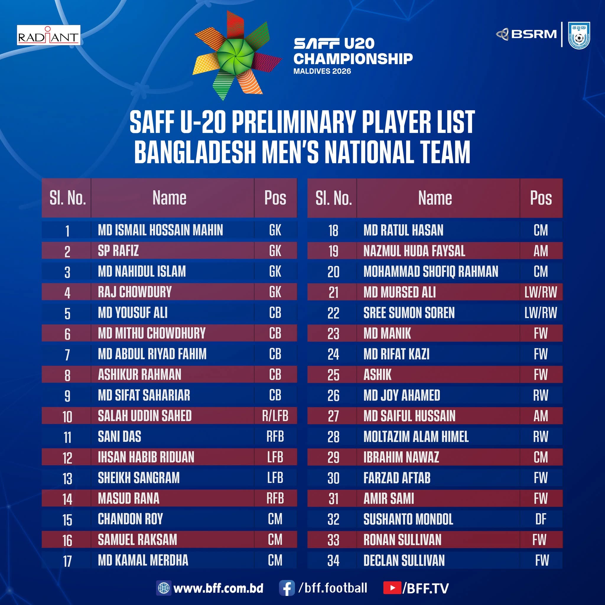 The squad, announced earlier by the Bangladesh Football Federation, includes several promising young players as the team intensifies its build-up to the regional tournament.