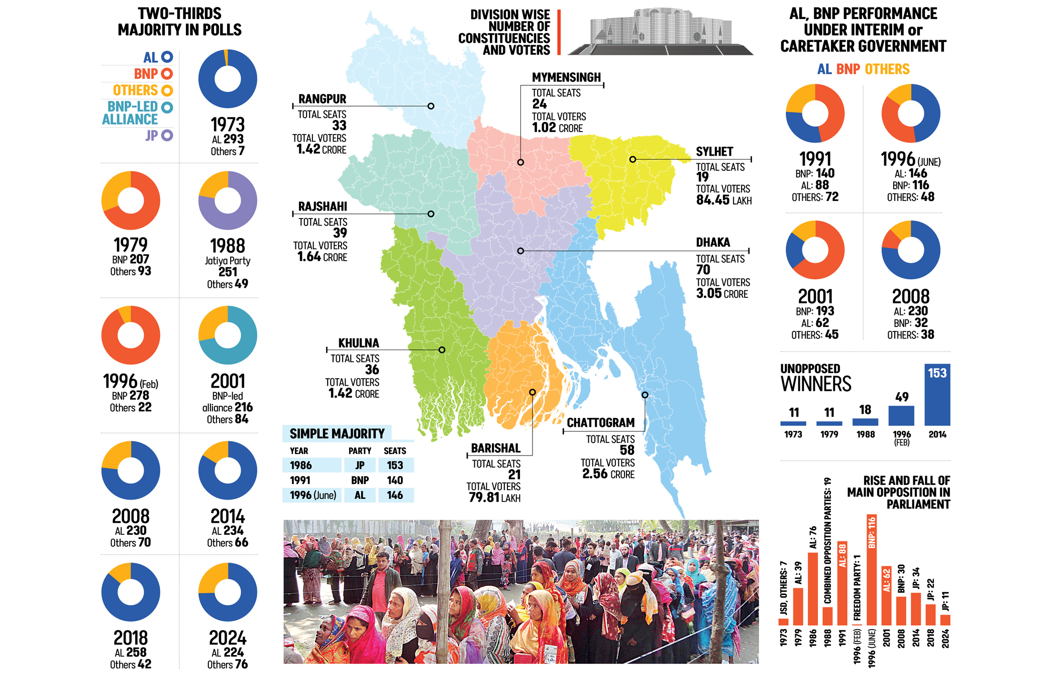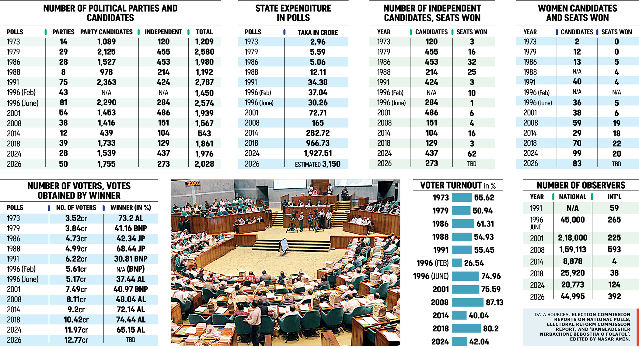 Since independence, Bangladesh has gone to the polls twelve times, and another election is now approaching. Across this long journey, one fact stands out: no ruling party has ever lost an election while in office. The Awami League first tasted victory while in office in 1973. Decades later, it returned to power in June 1996. It won again in 2008 and later in three consecutive elections -- 2014, 2018, and 2024. Those victories, however, came under a cloud. The 2014 and 2024 contests were condemned as “one-sided” and boycotted by the opposition. The 2018 election carried even darker allegations, with claims that ballot boxes were stuffed the night before voting. Critics branded all three as “sham polls”. The Bangladesh Nationalist Party (BNP) also had its moments, winning in 1979 and again in the short-lived February 1996 election and in 2001. The Jatiya Party, under military ruler HM Ershad, claimed back-to-back victories in 1986 and 1988 -- both boycotted and both one-sided. Amid this cycle of dominance, there were flashes of credible consensus. Four elections -- 1991, June 1996, 2001, and 2008 -- were held under caretaker or interim governments. Each time, the party that had ruled before the interim or caretaker administration lost, showing that free and fair elections could indeed change power.The broader record, however, tells another story. Bangladesh has endured five one-sided polls -- 1986, 1988, February 1996, 2014, and 2024 -- each marked by opposition boycotts. The Awami League secured a two-thirds majority five times, the BNP twice outright and once with allies, and the Jatiya Party once.