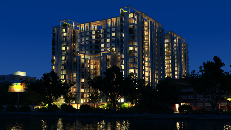 The architecture celebrates light and airflow: every home is designed with three open sides to encourage natural cross-ventilation, expansive living and dining zones, and large windows that frame landscaped courts and tree-lined promenades. Nearly sixty-two percent of the site is reserved for greenery — jogging tracks, shaded seating courts and intimate garden rooms — so residents live within a planted setting rather than beside it. Arrival is dignified: a sixty-foot approach road, a sculpted double-height lobby and attentive concierge services set a calm and welcoming tone.