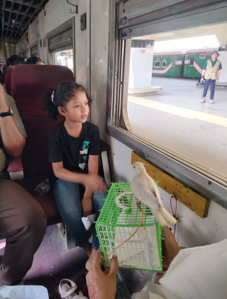 The unusual travel companion quickly became a source of delight for fellow passengers. Many smiled upon noticing the child and her bird, while three foreign travellers took photos when the train was at Kamalapur Railway Station in Dhaka.