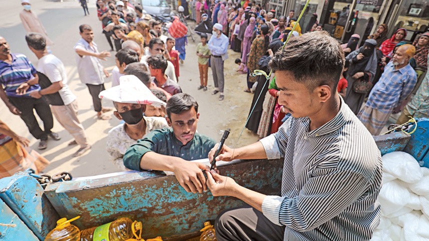 Vendors apply indelible ink to the fingers of TCB consumers to prevent repeat purchases under a new rule, as they distribute essential goods at subsidised prices to the buyers standing in line in the Agrabad area of the port city yesterday. PHOTO: RAJIB RAIHAN