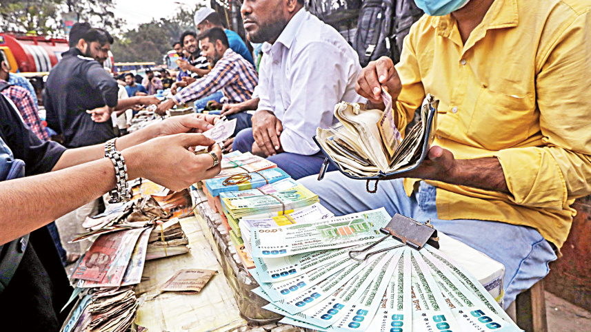 With demand for fresh banknotes rising ahead of Eid, roadside vendors in Gulistan have become busy exchange points for people swapping old or defective notes for shiny new ones, often taking a small commission for the service. People collect fresh notes for Eid salami, a tradition in which elders give money to children on the festive day. The photo was taken yesterday. Photo: Prabir Das