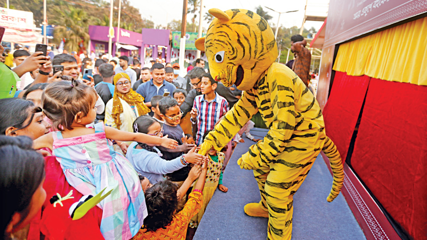 CHILDREN’S DAY OUT AT BOI MELA… A Bengal Tiger mascot from the Kaktarua Puppet Theatre makes a sudden appearance on stage and greets children during a puppet show at the children’s corner of Amar Ekushey Book Fair. As it was the weekend yesterday, many parents brought their children to the fair in Suhrawardy Udyan. Photo: Firoz Ahmed