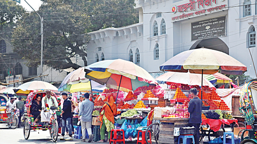 Vendors have set up stalls at the entrance to the emergency department of Dhaka Medical College Hospital, restricting access for patients in need of urgent care. The illegal road occupation leads to congestion and chaos in the area that already sees heavy traffic from ambulances and other vehicles. The photo was taken yesterday. Photo: Palash Khan