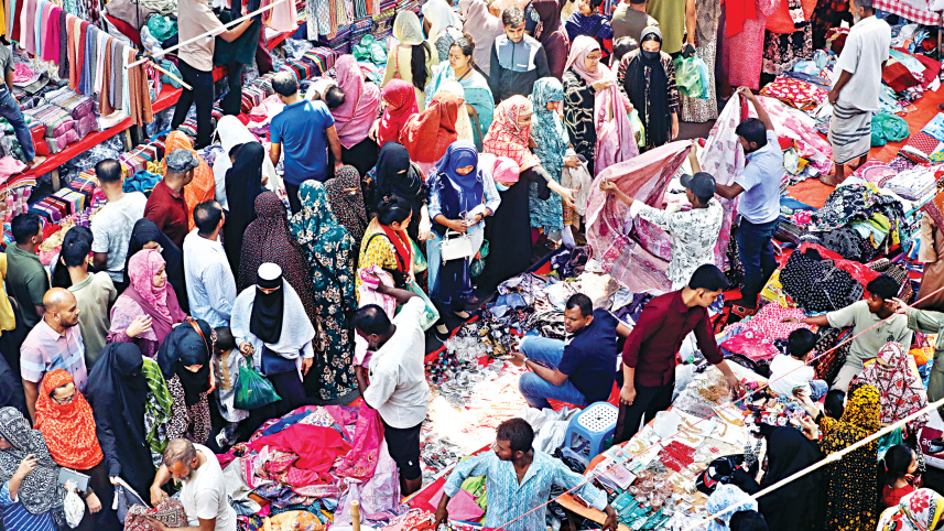 BUZZING WITH ACTIVITY… With Eid approaching, roadside markets for clothes are drawing more and more crowds, especially on the weekends. The photo was taken near Motijheel Ideal School in the capital yesterday. Photo: Prabir Das
