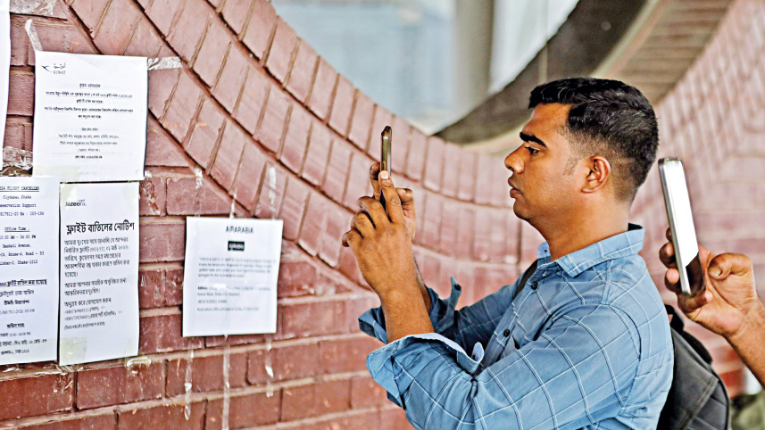 A passenger checks revised flight schedules at Dhaka airport yesterday, as flights from the capital to several Middle Eastern destinations have been suspended since Saturday afternoon after airports shut down following US and Israeli strikes on Iran and Tehran’s subsequent retaliation in the Gulf. Photo: Mehedi Hasan