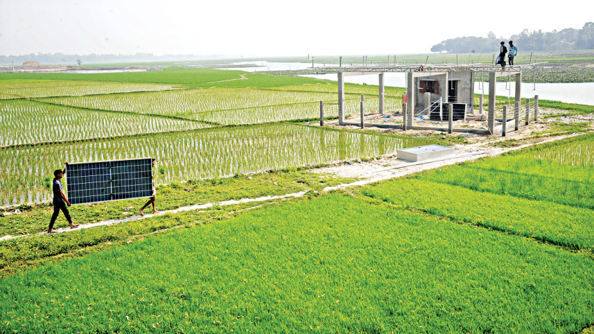 Solar-powered irrigation systems are being installed across different upazilas of Naogaon. Farmers are now using such renewable energy sources to draw water from underground sources to meet irrigation needs. The photo was taken yesterday in the Delwarbari area of Manda upazila, Naogaon. Photo: Azahar Uddin