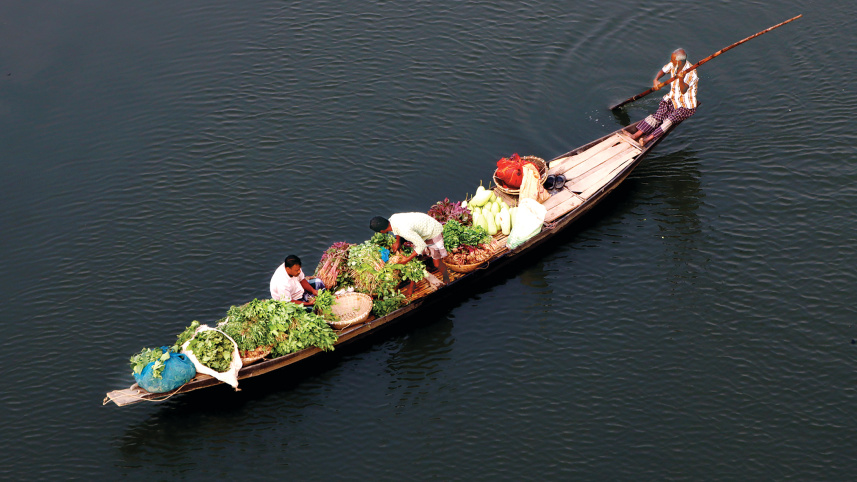 Off to the market: Farmers in Sylhet set out at dawn with boats loaded with fresh produce from villages and head towards the city. By bypassing middlemen and selling directly to consumers, growers are receiving fair prices, while city dwellers are happy to get fresh vegetables at lower rates. Farmers say they will continue bringing vegetables by river to designated city docks throughout the holy month of Ramadan. The photo was taken recently near Tuker Bazar in Sylhet city. Photo: Sheikh Nasir